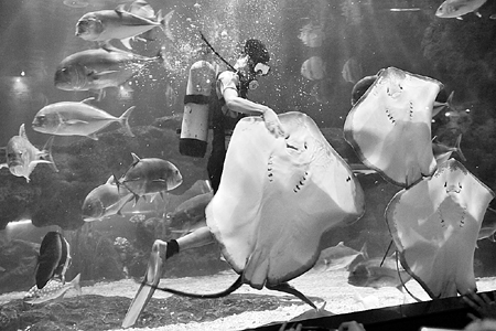 飼養(yǎng)員告訴記者,“魔鬼魚”(鰩魚)體型大小各異,小“魔鬼魚”成體僅50厘米,大“魔鬼魚”可長達2.5米,“魔鬼魚”無害,底棲,常常部分埋于水底沙中,游動時靠胸鰭作優(yōu)美的波浪狀擺動前進。