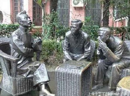 走過收藏館,前面站著新文化運(yùn)動的先驅(qū)者之一沈尹默先生,拿著雨傘,夾著報(bào)紙,眼神中閃著詩人的神采,注視著來來往往尋找“新文化”的游人! 夕拾鐘樓”對面的長椅上,坐著著名作家丁玲,正在聚精會神地讀信,可巧,不遠(yuǎn)處的“山原畫廊”門前就有個郵政信筒,這可是費(fèi)盡心機(jī)尋找并經(jīng)修復(fù)的舊時(shí)之物,而今也有郵遞員準(zhǔn)時(shí)來取信。拐彎過去,“名人茶藝館”門前的綠化叢中,偉大的文學(xué)家、思想家、革命家魯迅先生,以人們所熟悉的身姿端坐在藤椅上,他邊上站著中國共產(chǎn)黨早期領(lǐng)導(dǎo)人之一、中國革命文學(xué)事業(yè)的奠基人之一瞿秋白。