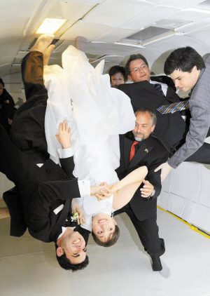6月20日,來(lái)自美國(guó)紐約的諾厄·富勒莫和埃琳·芬尼根(倒立者)在一架特制的波音727型飛機(jī)上舉行“零重力”婚禮。當(dāng)天,這對(duì)新人搭乘這架飛機(jī)從位于佛羅里達(dá)州卡納維拉爾角的肯尼迪航天中心出發(fā),成為世界上首對(duì)在零重力狀態(tài)下舉行婚禮的夫婦。新華社/路透