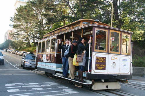 CableCar(纜車)是舊金山最著名的交通工具,有一百多年歷史了。通俗一點還是叫叮當車吧。那紅色鑲金的木制纜車在坡度頗陡的路上爬上爬下,一路鈴聲叮當。乘客多是游人,喜歡站在車廂旁的踏腳上,御風而行的感覺很棒。在觀賞美景的同時,自己也成了一道風景。 漁人碼頭、聯(lián)合廣場、花街等景點都有車站。