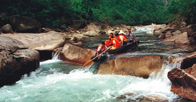 漂流景色:兩岸原始森林郁郁蔥蔥,連綿起伏,桐木溪宛如一條生命的飄帶,輕盈而飄逸地鑲嵌在兩岸深深的峽谷中,把大山生命的節(jié)奏舒展得靈動而有情趣。那寬窄不一的河床,縱橫交錯的巖石,浪花飛濺的激流,濤聲喧囂的韻律,山水和諧的景致,無不構(gòu)成一條最原始最天然的漂流河段。