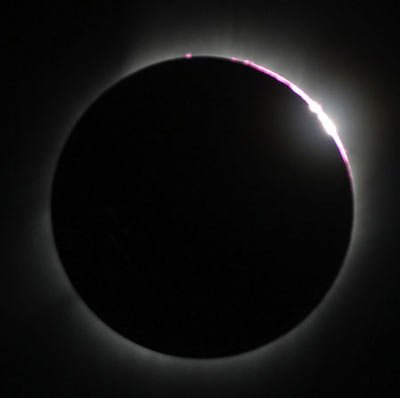月亮繼續(xù)往東移動(dòng),當(dāng)月面的西邊緣和日面的西邊緣相內(nèi)切的瞬間,稱為生光,它是日全食結(jié)束的時(shí)刻。在生光發(fā)生之前,鉆石環(huán)、貝利珠的現(xiàn)象會(huì)出現(xiàn)在太陽(yáng)的西邊緣,但很快就會(huì)消失。接著在太陽(yáng)西邊緣又射出一線刺眼的光芒,在日全食時(shí)可以看到的色球?qū)、日珥、日冕等現(xiàn)象迅即隱沒在陽(yáng)光之中,星星也消失了,陽(yáng)光重新普照大地。