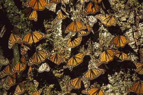 這片占地56259公頃的生態(tài)圈位于墨西哥城西北大約100公里處草木叢生的山上。每年秋天都有數百萬或者十億只蝴蝶從北美洲的廣闊區(qū)域來到這里,匯聚在森林保護區(qū)的狹小空間內,將叢林樹木點綴成橙色,它們的總重量將樹枝壓彎。春天,這些蝴蝶經過8個月遷徙,往返東加拿大一次,在這個過程中,有4代蝴蝶出生和死亡。它們是如何找到返回越冬地的路線的至今仍是一個謎。(注:墨西哥曾拍攝一部美洲王蝶的紀錄片:《遷徙的王蝶》)