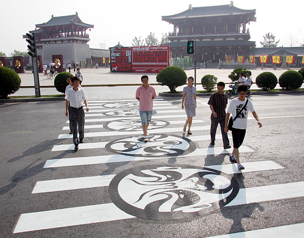 2009年7月7日,在西安市曲江芙蓉園街區(qū),兩條具有文化韻味濃厚,創(chuàng)意獨(dú)特、非常有個性秦腔戲曲臉譜、關(guān)中皮影斑馬線亮相街頭,吸引了眾多市民注意。