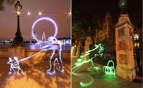 看,這里有名男子正在泰晤士河邊遛狗;自然歷史博物館外出現(xiàn)了一只大恐龍!