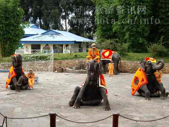 云南民族村,會(huì)跳舞的大象笨拙可愛(ài)的表演。大象在訓(xùn)練師的指揮下,有的作揖,有的高歌一曲。中間的這頭大象正昂頭高歌呢。