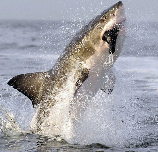 在攝影師Chris Brunskill的鏡頭中,大白鯊雖然體形碩大,捕食時(shí)卻身手矯健,縱身躍出水面6米高,張開大嘴將它的“美食”緊緊咬在口中。