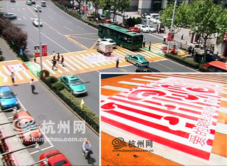 杭州愛心斑馬線,寬約2米、紅白相間十幾顆大大小小的愛心遍布其中,上面寫著一句“愛的宣言”:愛的路上有你,有我。