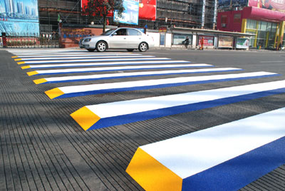 浙江省臺州立體彩色斑馬線,是通過藍白黃三色相間彩條,使平面的斑馬線呈現(xiàn)立體感,通過給行人或司機強烈的視覺刺激,從而增強對車輛行人的交通警示性。