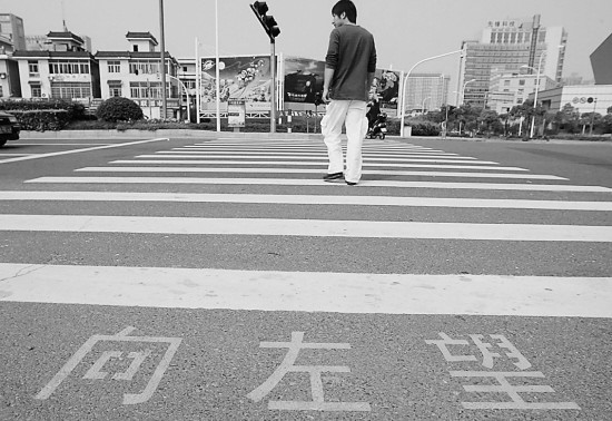 杭州濱江區(qū)3條主要街道上的22個繁忙路口,未發(fā)生一起斑馬線上的交通事故。這都要歸功于那幾個寫在斑馬線上的大字:“向左望”,“向右望”。碩大的字寫在斑馬線兩端,讓行人不由得放慢腳步。
