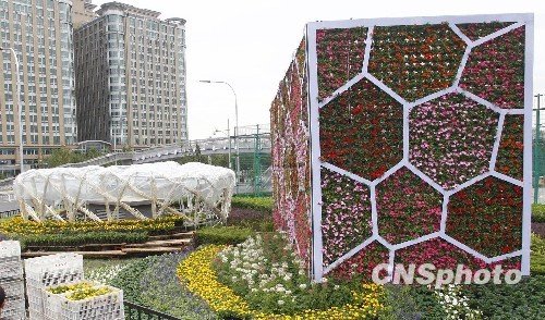 “水立方鳥(niǎo)巢”花壇正在組裝中