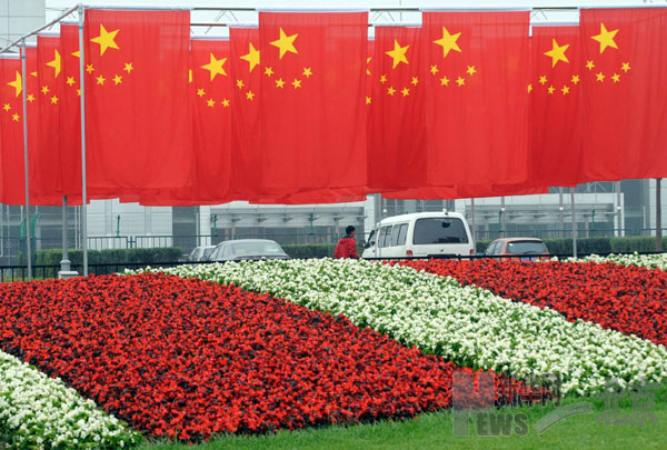 9月28日,許多路人在北京海淀公園東門(mén)國(guó)旗“旗陣”前駐足觀看或是拍照留念。這片由150面國(guó)旗組成的旗陣從9月25日亮相后,成為北京街頭的新景觀。據(jù)了解,這組旗陣長(zhǎng)88米,寬15米,由6個(gè)大小相同的小旗陣組成,寓意新中國(guó)60歲生日的到來(lái)。新華社記者唐召明攝