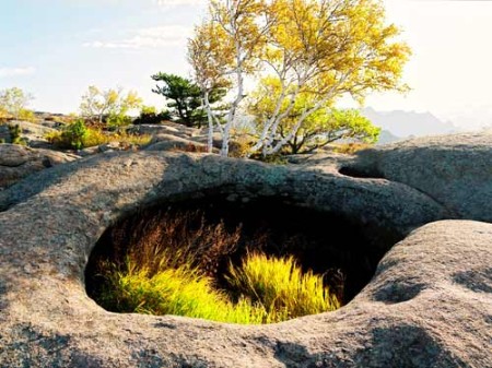 僧石、將軍石、美女石、鷹石、猴石、蛇石、棺石、龜石,或擬人或擬獸,神態(tài)各異,特別是大自然鬼斧神工造就的“世界奇觀”第四紀(jì)冰川遺跡——冰臼群、冰石林、刃脊、角峰、石河等更令人嘆為觀止,在山頂2平方公里的范圍內(nèi),有大小冰臼200余個,數(shù)量之多,規(guī)模之大實(shí)屬世界罕見,冰臼群中大的如缸,小的似盆,當(dāng)?shù)厝撕茉缇徒o這里起了“九缸十八鍋”的名稱,地質(zhì)界權(quán)威人士說:“大青山第四紀(jì)冰川遺跡是我國目前發(fā)現(xiàn)的數(shù)量最多、分布最廣、海拔最高、形態(tài)各異、保存完好、特征十分明顯的古冰川遺跡”。