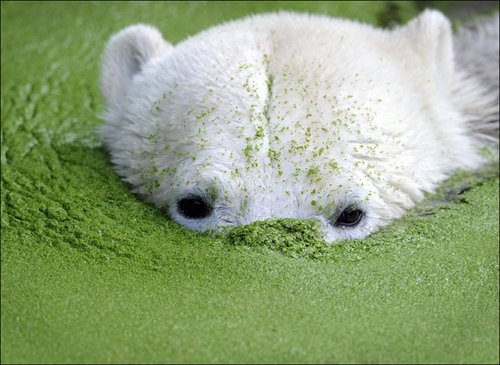 北極熊明星克努特在滿是浮萍的柏林動物園的一個湖里游泳?伺叵壬姆劢z們焦急地等待著它與其3歲大的“女朋友”吉安娜的首次見面。動物園的工作人員打算先讓克努特和吉安娜彼此熟悉一段時間,之后再讓它們“成親”。