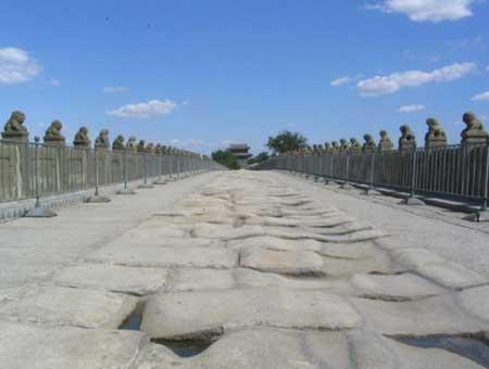 盧溝橋(Lugou Bridge) 亦作蘆溝橋,在北京市西南約15公里豐臺區(qū)永定河上,是北京市現(xiàn)存最古老的石造聯(lián)拱橋。永定河舊稱盧溝河,橋亦以盧溝命名。始建于金大定二十九年(1189年),明正統(tǒng)九年(1444年)重修。清康熙時毀于洪水,康熙三十七年(1698年)重建,如今永定河上已經(jīng)沒有水了。盧溝橋全長267米,寬7.6米,最寬處可達9.5米。有橋墩十座,共11孔,整個橋體都是石結(jié)構(gòu),關(guān)鍵部位均有銀錠鐵榫連接,為華北最長的古代石橋。