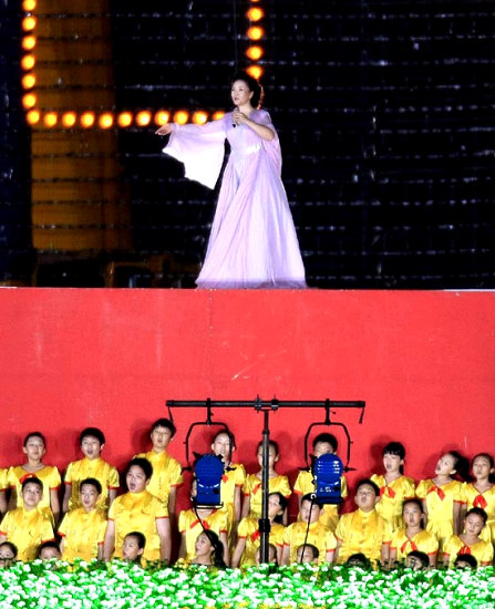 歌唱家彭麗媛在天安門廣場一展歌喉。