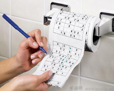 很多人都喜歡如廁的時候看報(bào)紙或是雜志打發(fā)時間,有沒有想過來點(diǎn)腦力勞動鍛煉一下松弛的神經(jīng)?這卷衛(wèi)生紙可以幫你做到,它是一個經(jīng)典的9格填數(shù)游戲,而且數(shù)量龐大怎么都填不完,保證讓你樂此不疲。