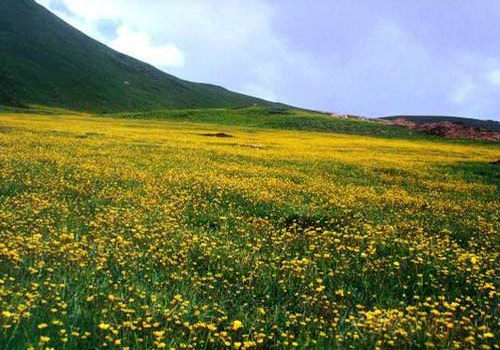 每年七月中旬,整個灘上遍開整齊而又平展的金蓮花,策馬灘上,馬蹄下迸出一抹金燦燦花塵,蹄香不言而喻。到八月金蓮花悄然隱退,代之以天藍色的龍膽共,整個花灘一片蔚蘭,灘接天際,天地一色。