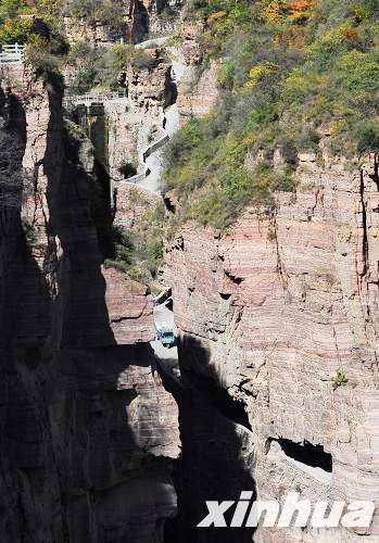 10月22日,一輛汽車從郭亮村的絕壁長(zhǎng)廊中穿行而過。
