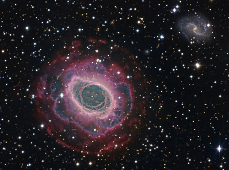 環(huán)狀星云的一幅新照片,由西班牙卡拉爾·阿爾托天文臺(tái)拍攝。照片以空前的細(xì)節(jié)展示了來(lái)自星云中央恒星的氣體形成的燈絲狀環(huán)形結(jié)構(gòu)。一個(gè)更為遙遠(yuǎn)的螺旋星系位于照片右上方。環(huán)狀星云呈薔薇色,距地球大約2000光年,是一顆類日恒星的殘余。恒星死亡時(shí)剝離其外部氣體殼,留下一個(gè)被稱之為“白矮星”的密集核心,周?chē)欢鄬訜霟岘h(huán)形結(jié)構(gòu)環(huán)繞。