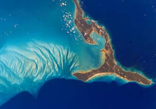 伊柳塞拉島西部壯觀的水下結(jié)構(gòu)由碳酸鈣沙構(gòu)成,碳酸鈣沙來(lái)自于被洋流侵蝕的珊瑚礁沉積后形成的沙丘。照片由空間站上的宇航員于2002年拍攝。