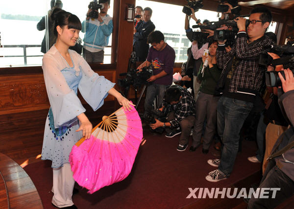 “笙歌畫舫十二女”之一的劉倪華在杭州西湖畫舫“蘭桋”號上進行扇舞表演