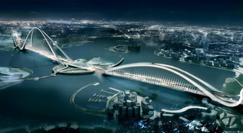 迪拜正在建設(shè)國(guó)內(nèi)首座,也是世界上最大和最高的拱橋。這張俯瞰圖是紐約建筑公司fxfowle的設(shè)計(jì)圖。這座橋梁于2008年3月開(kāi)始施工,有望在2012年竣工。