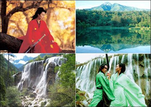 NO.2 《英雄》——九寨溝 被稱為“動(dòng)物的活化石”,有熊貓必定有供熊貓食用的箭竹。冬季,其他湖面都已經(jīng)結(jié)上厚厚的冰層,但箭竹海還是一汪碧水。箭竹海中,有許多被鈣化的枯木,形成奇特的珊瑚樹,而在腐木上又可見一些新生的樹,這被稱為腐木更新,或叫枯木逢春和再生樹。無風(fēng)的時(shí)候,可欣賞到箭竹海的倒影,F(xiàn)在箭竹海以前有名是因?yàn)椤队⑿邸吩诰耪瘻系耐饩暗剡x擇的是箭竹海,這里吸引了許多國內(nèi)外的游客來“看稀罕”。