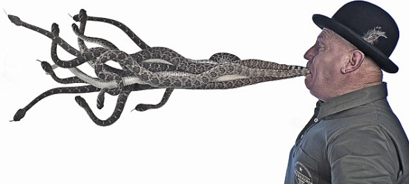杰基-畢比在2009年創(chuàng)造了一次在嘴里叼蛇數(shù)目最多的世界紀錄