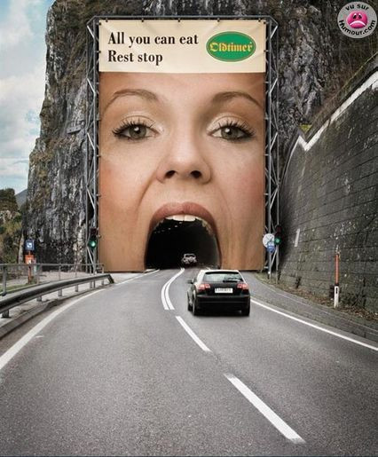 高速公路服務站廣告:這幅令人驚訝的廣告設在一個隧道的入口,正試圖吸引來自奧地利駕車旅行的人們,來到一個名叫Oldtimer的高速公路休息區(qū)消費。