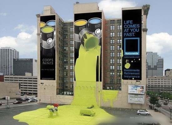 保險公司廣告:流出畫面的綠色油漆海報,是美國德克薩斯州的保險公司為了鼓勵人們,購買全國保險而精心制作的。這家公司租用了三面墻、三輛車以及這家停車場,才得以完成這幅廣告。