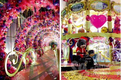 大門外,有飛鹿與小丑組成的圣誕拱門、花環(huán)組成的星光大道;中庭里,有燈火輝煌的馬戲舞臺、懸空的飛鹿與小丑;還有大堂空間、天幕金街及天幕圓廳也都飛舞著艷麗的粉綢,整個裝飾美輪美奐,讓人流連忘返。