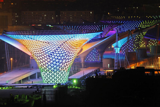 隨著世博腳步臨近,世博工地正熱火朝天的加快施工進(jìn)度,夜晚世博場(chǎng)館演繹燈光秀。郭長(zhǎng)耀/CFP