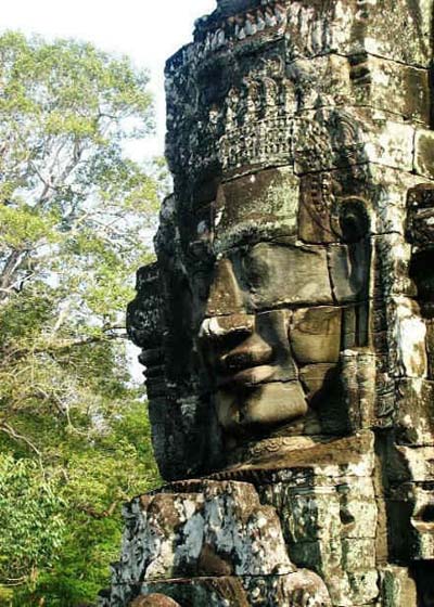 吳哥城是高棉帝國最后一座都城,城墻的四周佛像層疊起伏,令人肅然起敬。組成佛像的巨石之間,以一種混合棕櫚汁粘合,經(jīng)過七、八百年的風吹、日曬、雨林,至今依然堅實合縫,這不僅顯示了古代高棉國王的財富和權勢,也反映出其國民精湛的技術和藝術才能。