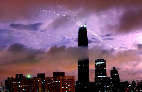 在一場暴風(fēng)雨中,432米高的廣州國際金融中心似乎和一道閃電實現(xiàn)了對接。