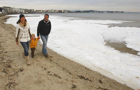 尼克和克琳娜-霍普伍德帶著他們的兒子湯姆在英國(guó)普爾市桑德班克斯地區(qū)的沙灘上散步。在普爾市桑德班克斯地區(qū),大海已經(jīng)開(kāi)始結(jié)冰。