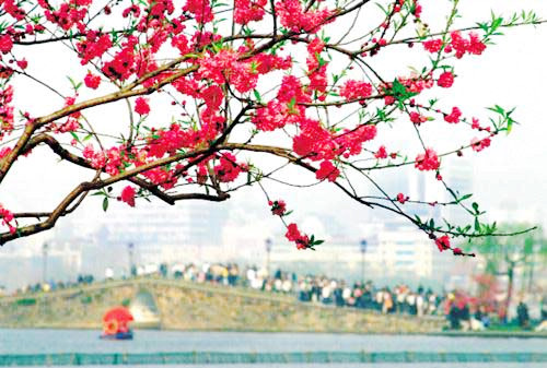 陽(yáng)春三月,春風(fēng)蕩漾,百花競(jìng)相吐艷,其中尤以桃花最有魅力。杭州西湖早在唐代就已廣栽桃花,如今的西湖蘇堤、白堤上,一株楊柳一株桃,花開時(shí)翠彩相間,千姿百態(tài)。漫步湖岸,令人心曠神怡。