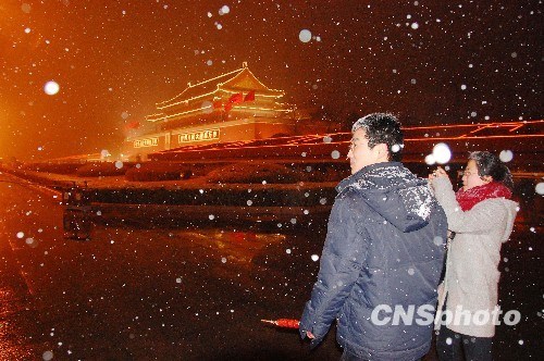 2月28日晚,北京城紛紛揚(yáng)揚(yáng)下起了雪,出現(xiàn)了“正月十五雪打燈”的景觀。圖為游客身披雪花在天安門前留影。中新社發(fā) 柯小軍攝