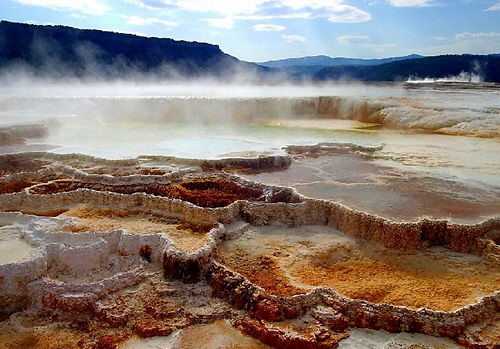 位于美國黃石公園猛犸溫泉,是世界上已探明的最大的碳酸鹽沉積溫泉。它最顯著的特點當(dāng)屬米涅瓦階地,那是幾千年來冷卻沉淀的溫泉水所形成的一連串階地。
