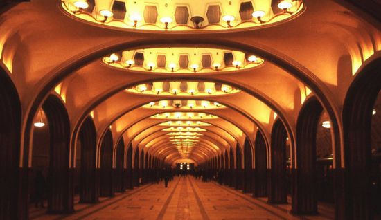 莫斯科早期建成的地鐵站,宛如一座座地下藝術(shù)宮殿,其氣魄之宏大、造型之華麗在世界上是少見的。每個(gè)站都經(jīng)過建筑師和藝術(shù)家精心設(shè)計(jì),鋪以大理石的墻面和地面!∪A麗的吊燈,富麗堂皇,集建筑、藝術(shù)和浮雕之精華,使每一座地鐵站猶如地下藝術(shù)宮殿,美不勝收,令人驚嘆不已。