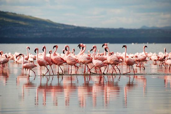 首都內(nèi)羅畢西部160公里(99英里)的肯尼亞裂谷。粉紅色的火烈鳥涉水渡過納庫魯湖(Lake Nakuru)。