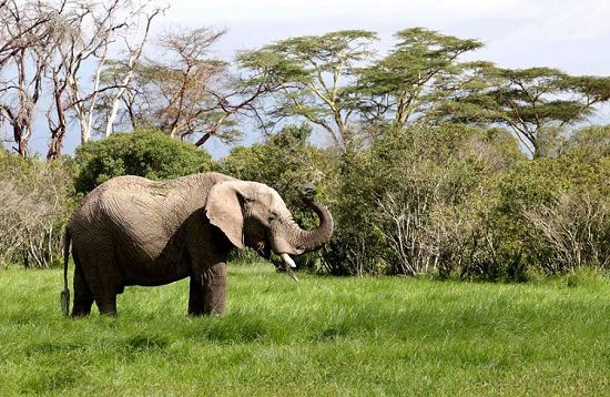 首都內(nèi)羅畢北350公里(217英里)紐納基鎮(zhèn)附近肯尼亞山坡。一頭大象在Ol Pejeta野生動(dòng)物保護(hù)區(qū)吃草。