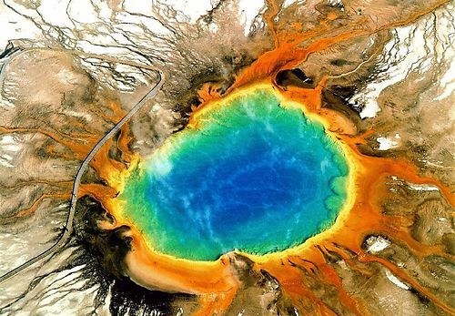 位于黃石國家公園的大棱鏡溫泉(又稱大虹彩溫泉),是美國最大,世界第三大的溫泉。它寬約75至91米,49米深,每分鐘大約會涌出2000公升,溫度為71°C左右的地下水。大棱鏡溫泉的美在于湖面的顏色隨季節(jié)而改變,春季,湖面從綠色變?yōu)闋N爛的橙紅色,這是由于富含礦物質(zhì)的水體中生活著的藻類和含色素的細菌等微生物,它們體內(nèi)的葉綠素和類胡蘿卜素的比例會隨季節(jié)變換而改變,于是水體也就呈現(xiàn)出不同的色彩。