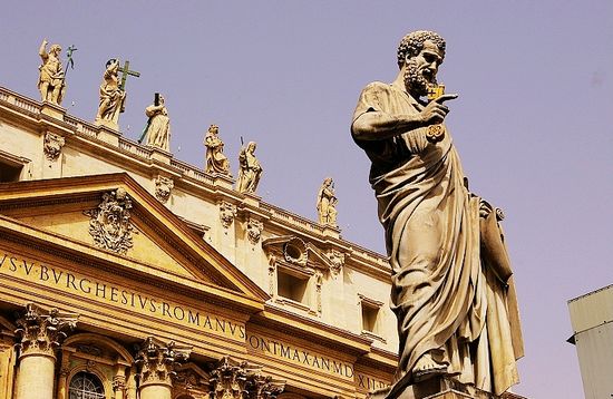 大教堂兩側(cè)有手持殉道長劍的圣保羅和手持兩把鑰匙的圣彼得。圣彼得高大的雕像,他神情自若、面帶微笑,右手握著兩把耶穌送給他的鑰匙,左手拿著一卷耶穌給他的圣旨。他頭上的縷縷卷發(fā)、臉上的根根皺紋、下巴上的撮撮胡須和身上的層層長袍無一不被雕琢得細(xì)膩、逼真。彼得是耶穌的12個(gè)門徒中的第一個(gè),耶穌去了天堂后把鑰匙交給了他,彼得成為了基督教的首領(lǐng),他來到羅馬傳教,后來,羅馬的皇帝為了嫁禍基督教,放火燒了羅馬城,然后歸罪于基督教,并處死了彼得。圣彼得大教堂就是為紀(jì)念彼得而修建的。