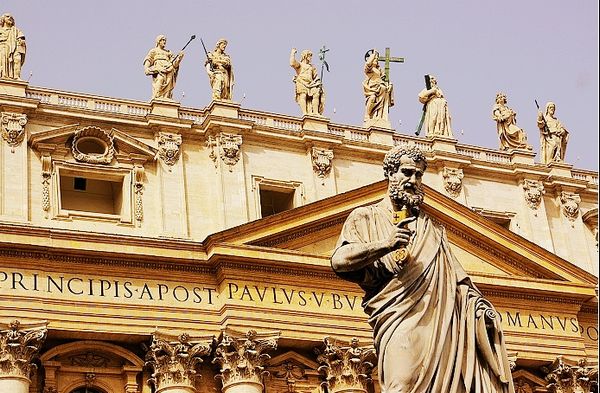 圣彼得大教堂頂上是耶穌和他的十二個(gè)弟子的雕像,原本耶穌有十三個(gè)弟子,但由于猶大的原因,所以只雕了十二個(gè),西方人對(duì)于十三的忌諱也在于此吧。中間那位抱十字架的就是耶穌了。