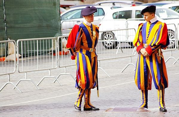 瑞士衛(wèi)隊身穿米開朗基羅設計的服裝,每年5月6日都要舉行宣誓儀式,誦念500年來一成不變的誓詞,祈求上帝保佑自己圓滿完成任務,為效忠教皇可以獻出自己的生命,F(xiàn)在的衛(wèi)兵們都成了一種禮儀性的展示,還熱情地為游客引導。