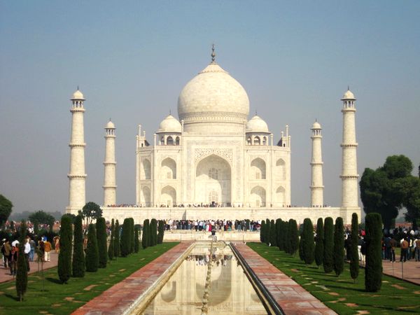 泰姬陵是印度知名度最高的古跡之一,在今印度距新德里200多公里外的北方邦的阿格拉 (Agra)城內,是莫臥兒王朝第5代皇帝沙賈汗為了紀念他已故皇后阿姬曼·芭奴而建立的陵墓,被譽為“完美建筑”。它由殿堂、鐘樓、尖塔、水池等構成,全部用純白色大理石建筑,用玻璃、瑪瑙鑲嵌,絢麗奪目、美麗無比。有極高的藝術價值。是伊斯蘭教建筑。中的代表作。2007年7月7日,成為世界八大奇跡之一。