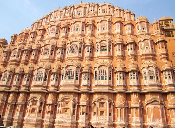 風(fēng)之宮是齋浦爾的地標(biāo)性建筑,名為“宮殿”,其實(shí)只是一幅“墻”。墻上密密麻麻布滿953扇窗。墻后沒(méi)有壯觀大堂,沒(méi)有華麗房間,只有如蜜蜂巢般的窗戶,這些窗戶是用紅砂石鏤空而成,呈半個(gè)八角形。窗戶設(shè)計(jì)得無(wú)比巧妙,讓涼風(fēng)輕輕透進(jìn)來(lái),風(fēng)涼水冷。在風(fēng)宮還鑲嵌著許多玻璃,每當(dāng)浩月當(dāng)空,整座風(fēng)宮閃閃發(fā)亮尤如繁星萬(wàn)點(diǎn),月色如織,故而又被稱(chēng)為是“月宮”。據(jù)說(shuō)是為了讓皇室中的女性成員可以觀看城市生活而建造的。進(jìn)去后發(fā)現(xiàn),墻壁上有一排排向下傾斜的小孔,想必小姐妃子們就是透過(guò)孔洞向下看的,而下面的人又看不到她們,以此保持她們的尊貴和不予褻瀆,同時(shí)又滿足了她們的好奇心。