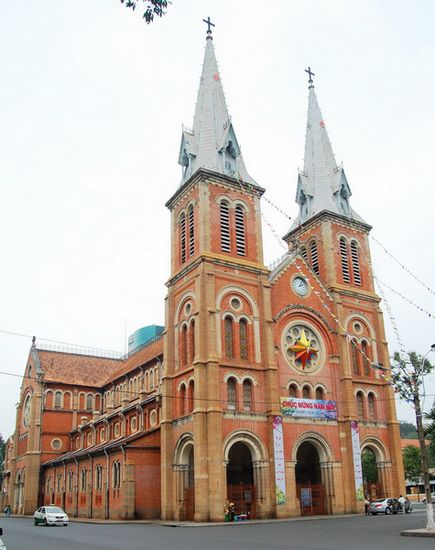 圣母大教堂也叫紅教堂,是西貢最著名的地標(biāo),它是1877年(也有資料說(shuō)是建成于1883年)留下的古老建筑,一個(gè)殖民時(shí)期的紀(jì)念品。據(jù)說(shuō)建造教堂的紅磚全部從法國(guó)運(yùn)來(lái),至今沒(méi)有絲毫褪色。在教堂前面的花園廣場(chǎng)上,佇立著一座重達(dá)4噸的圣母瑪麗亞雕像,那是1945年羅馬教會(huì)所贈(zèng)。