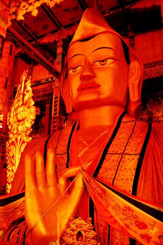 殿內(nèi)大佛,莊嚴(yán)肅穆,氣勢(shì)凜然。那殿內(nèi)的壁畫,顏色由稀有礦物調(diào)成,使用了大量黃金,畫面凹凸,有別日常所見,尤為美輪美奐。來到與大佛手部平行的樓層,寺管會(huì)主任遞過一條潔白的哈達(dá),只見我們此行的前輩揮手將哈達(dá)拋向佛手,哈達(dá)如一道飛舞的白練,恰到好處地落入大佛手中,須知欲將輕飄的哈達(dá)準(zhǔn)確送到5米開外的目標(biāo),絕非常事,此舉有若神助,對(duì)佛的敬仰之情虔誠(chéng)可鑒。